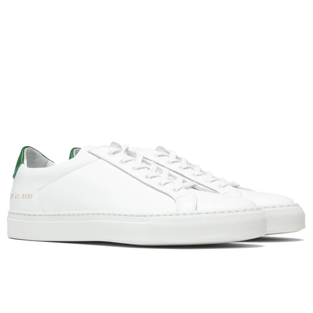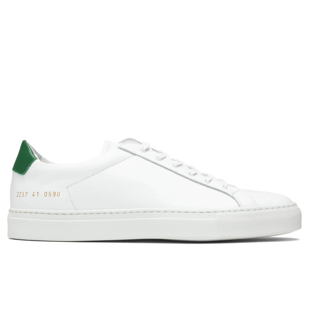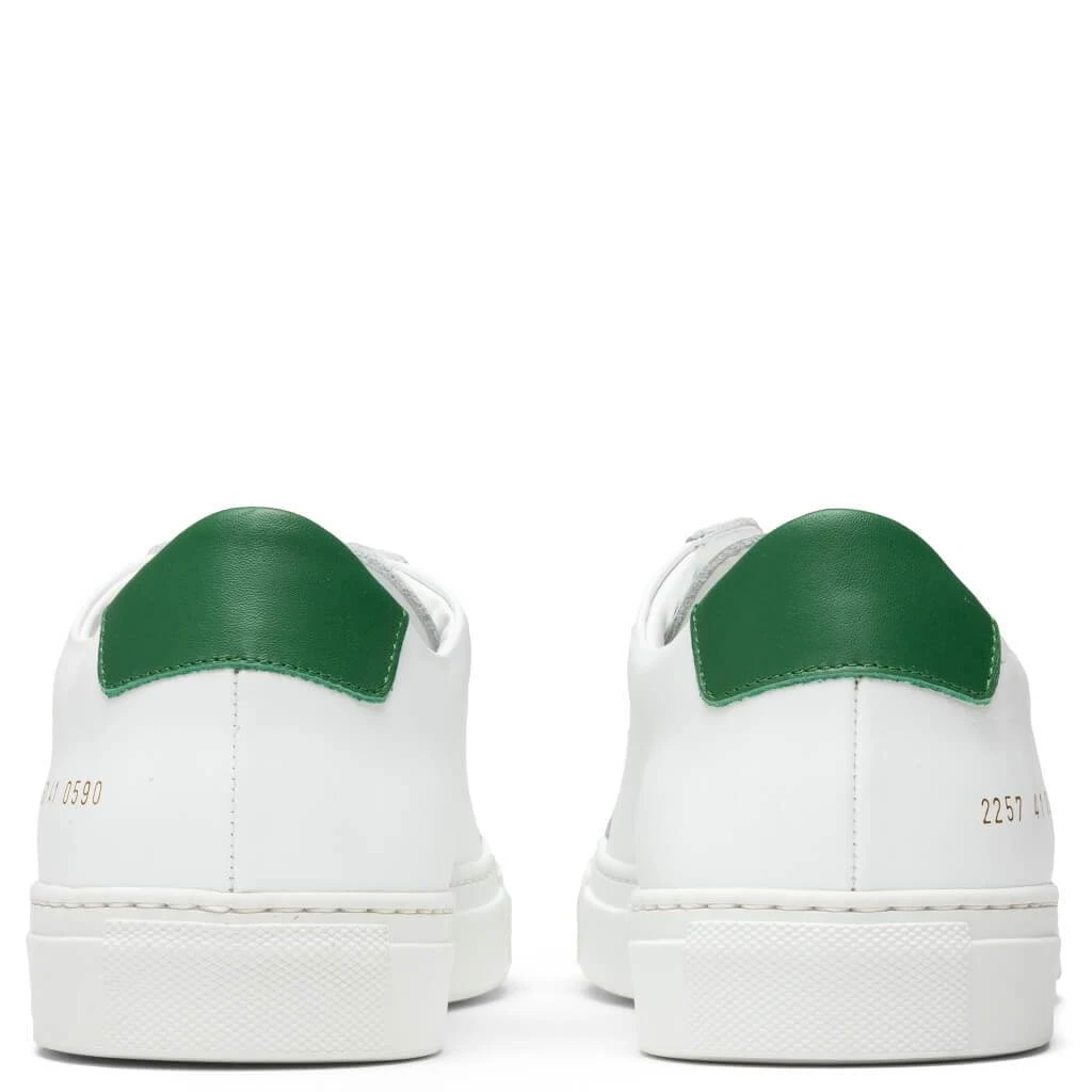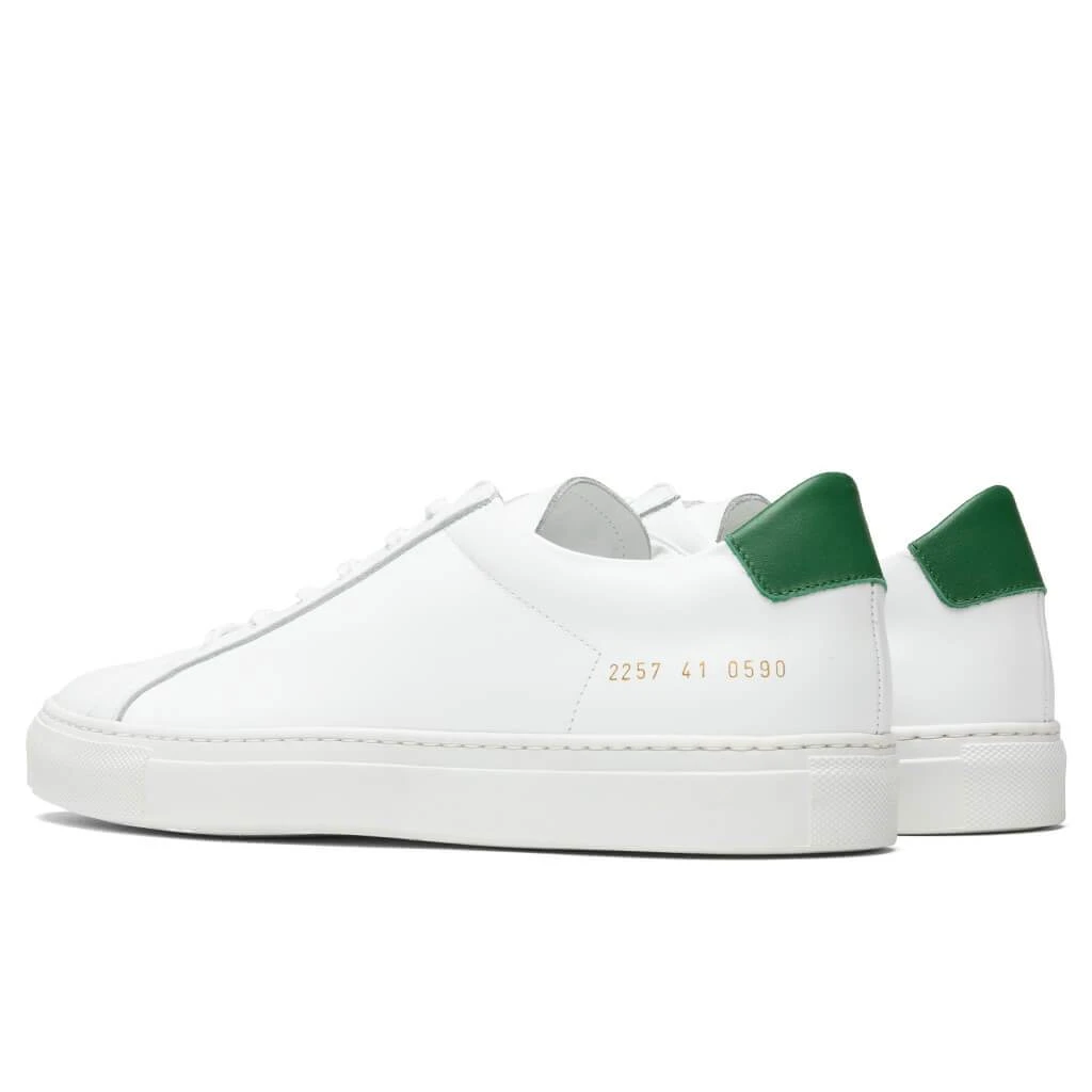Founded by Prathan Poopat and Flavio Girolami in 2004, Common Projects are best known for their signature gold stamp at the heel highlighting style and size. Assembled in Italy using the highest-quality materials, Common Projects pushes the standard in luxury footwear. Pictured is the Common Projects Retro Low in White/Green.