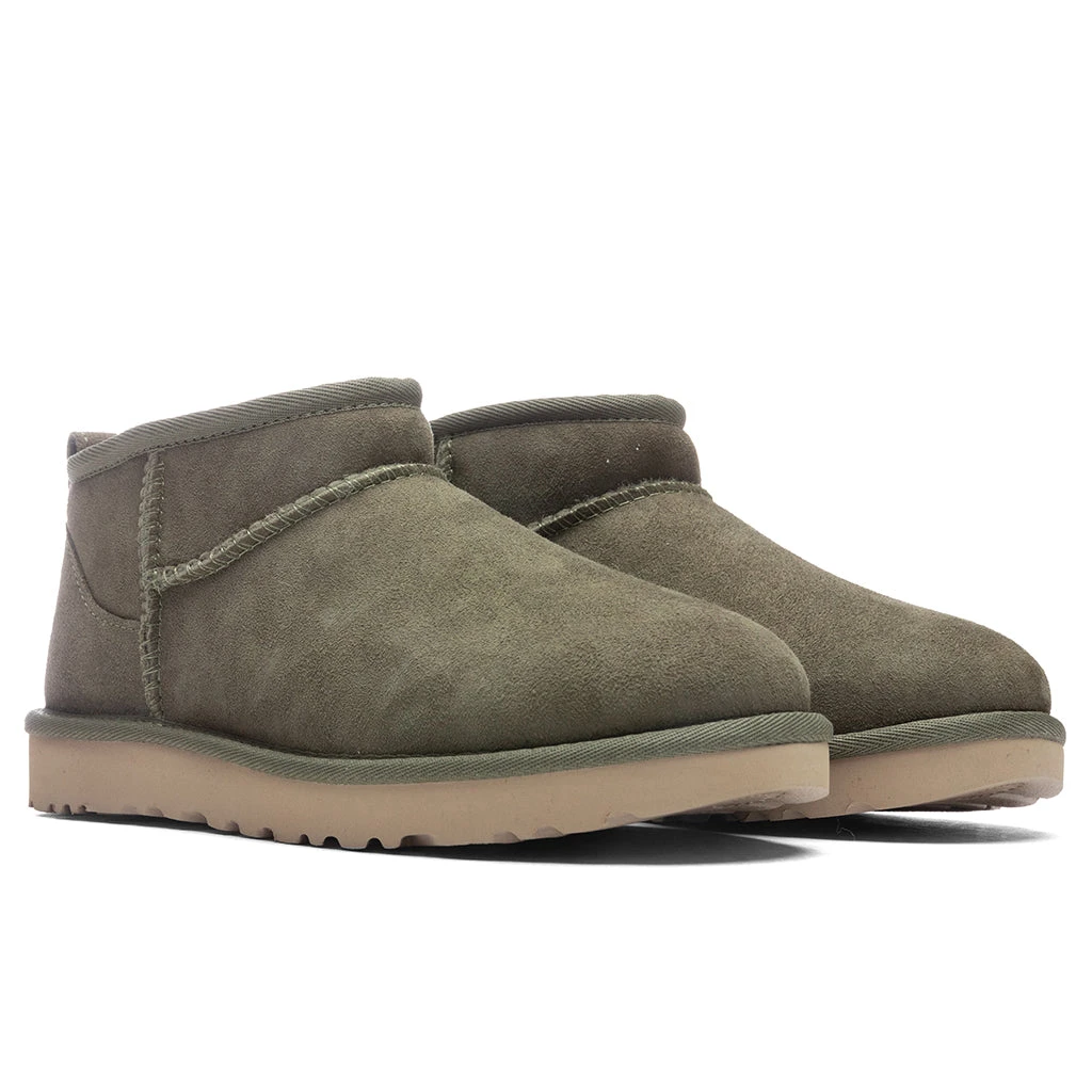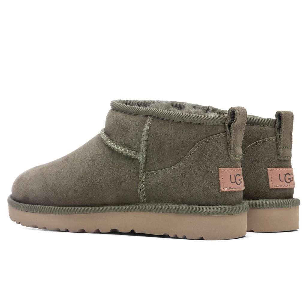 The UGG Womenโs Classic Ultra Mini Boot features a topically applied water repellency treatment making it the perfect footwear for all weather types. With a sheepskin upper and lining, the design is comfortable in its construction. A signature UGG Treadlite outsole is placed underneath for durability, while polyester binding and the leather heel tab complete the silhouette.
